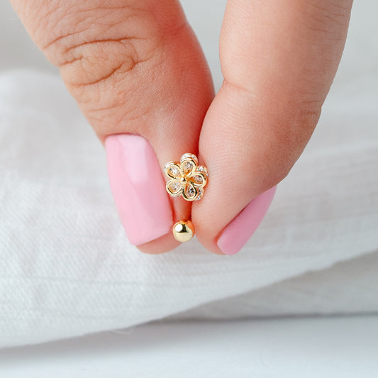 Aros pegados flor circones cierre pelotita bañado en oro
