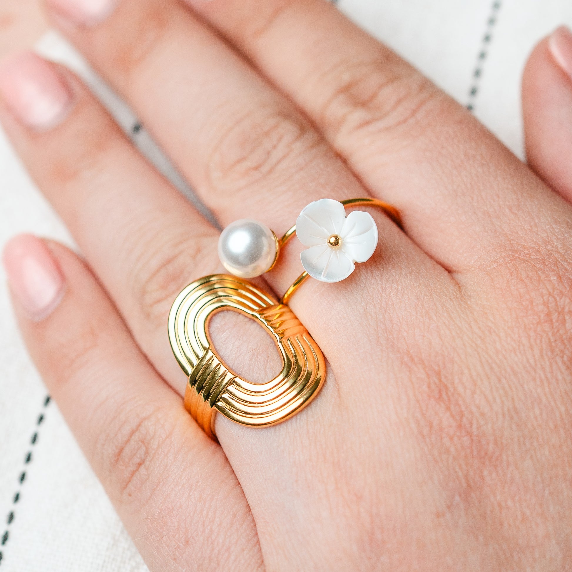 Un anillo delicado y femenino que combina la suavidad de una perla clásica con el encanto natural de una flor. Su diseño abierto y ajustable se adapta cómodamente a tu mano, creando un look luminoso y elegante.