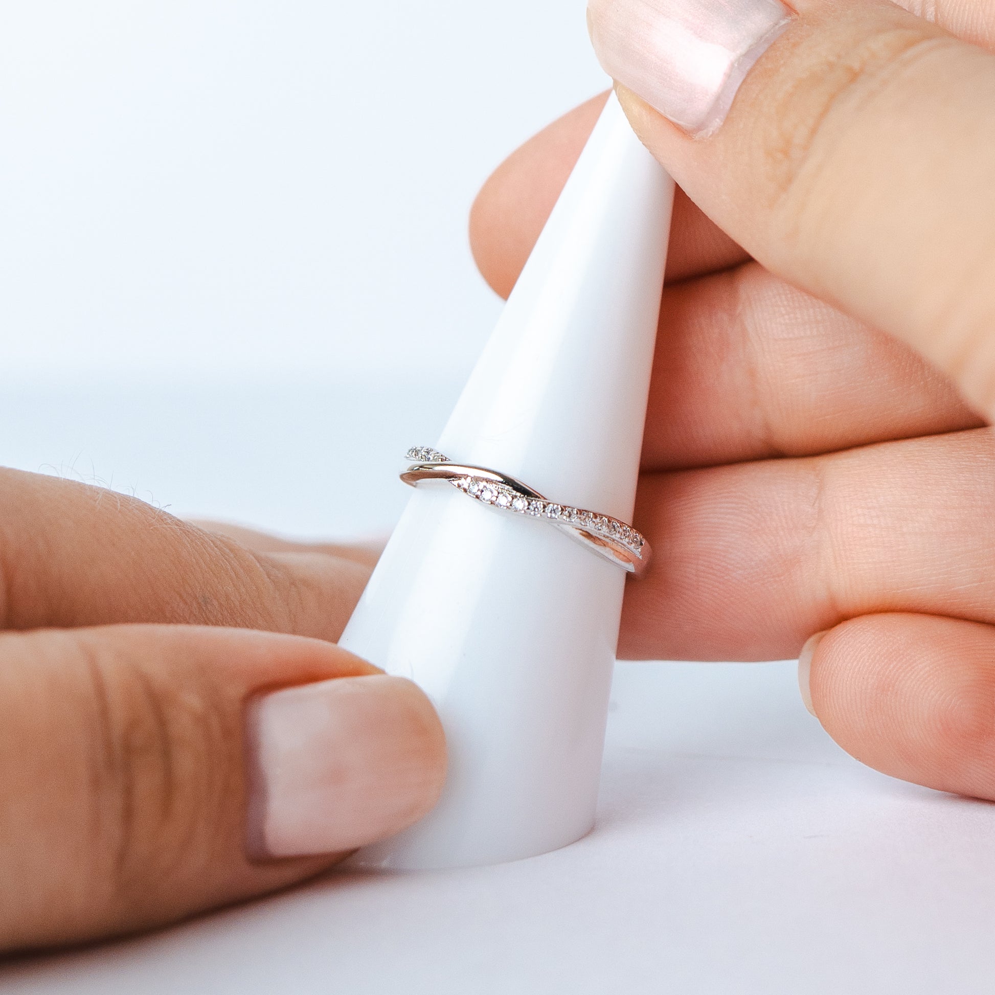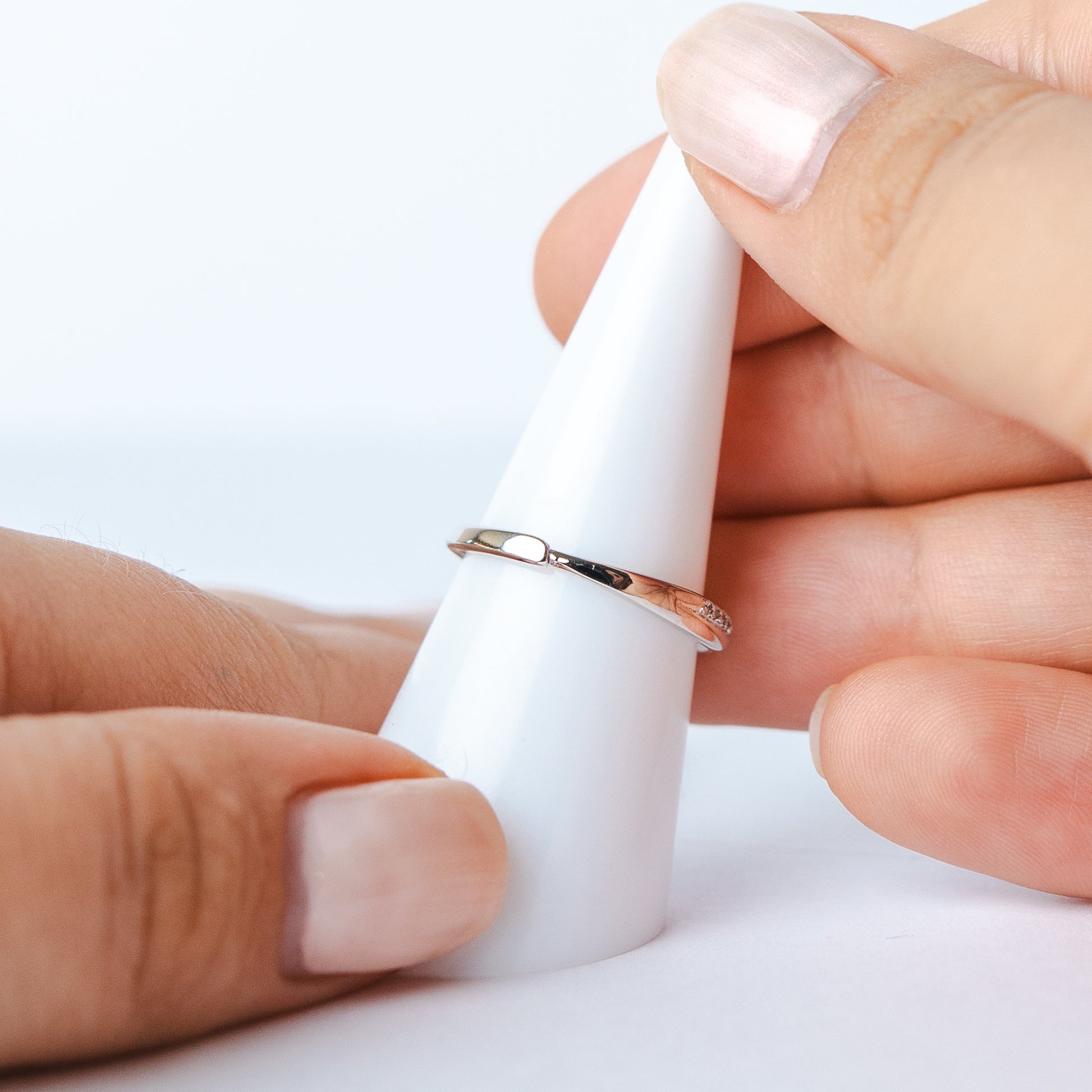 Uno de los anillos incorpora una línea de circones que aporta brillo sutil y sofisticado, mientras el otro mantiene un acabado pulido minimalista para un equilibrio perfecto entre luz y simpleza.