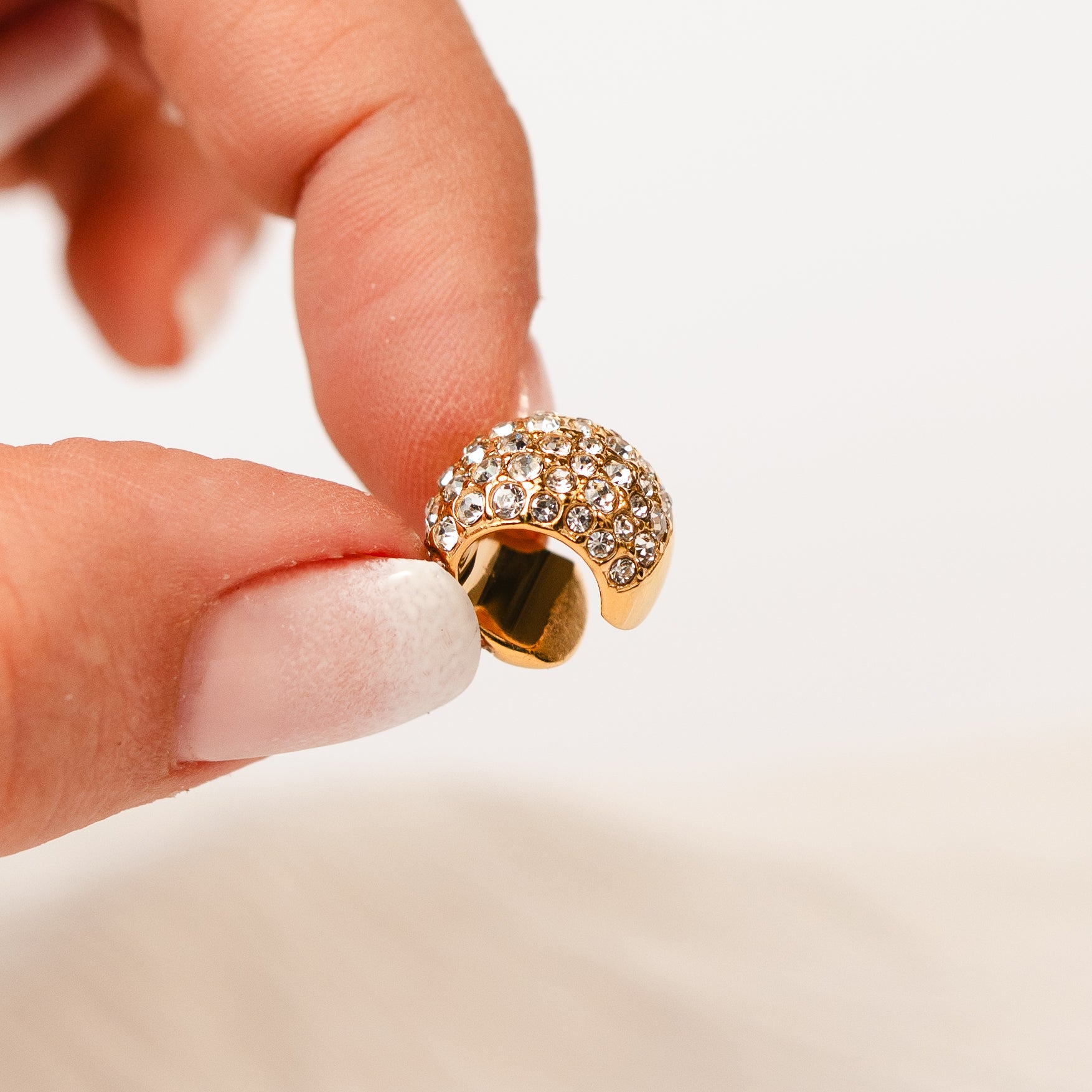 El Ear Cuff Golden Shine es esa joya que transforma cualquier look con un toque de lujo sutil. Su diseño curvo bañado en oro está cubierto de micro circones que reflejan la luz con cada movimiento, sin necesidad de perforación. Perfecto para usar solo o combinar con aros dorados, aportando elegancia y modernidad en un solo gesto.