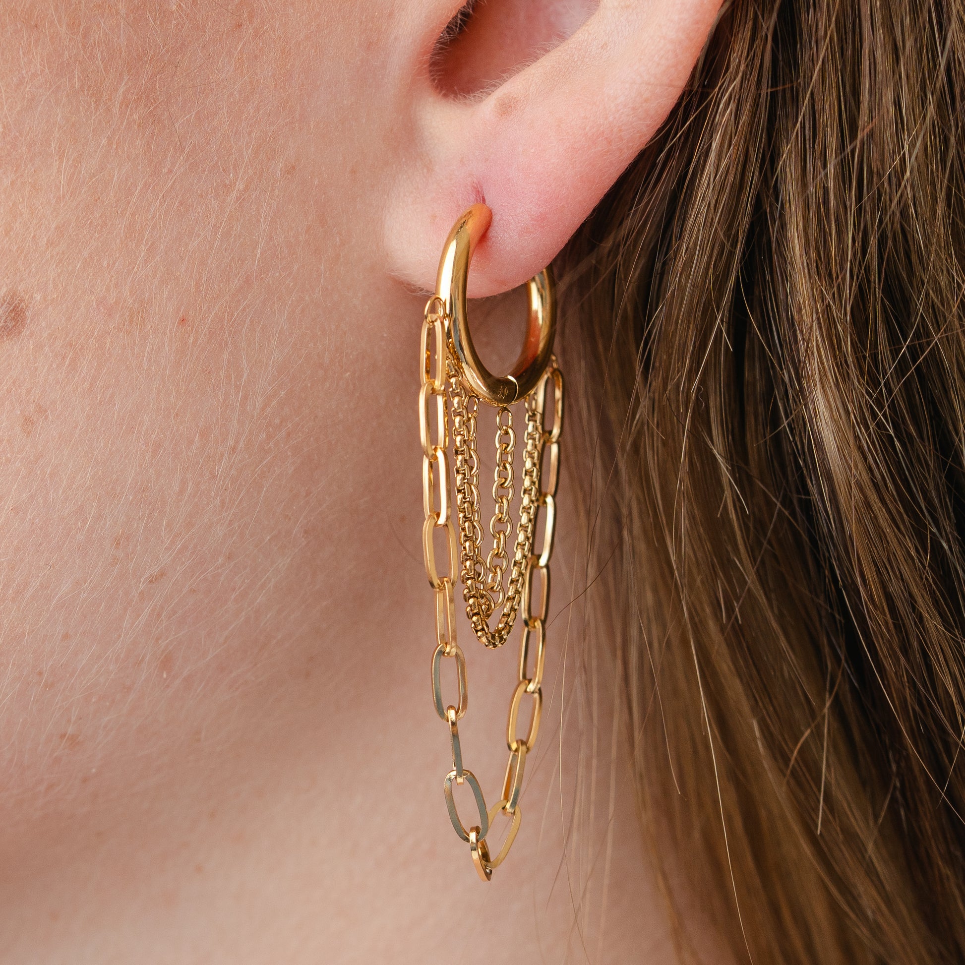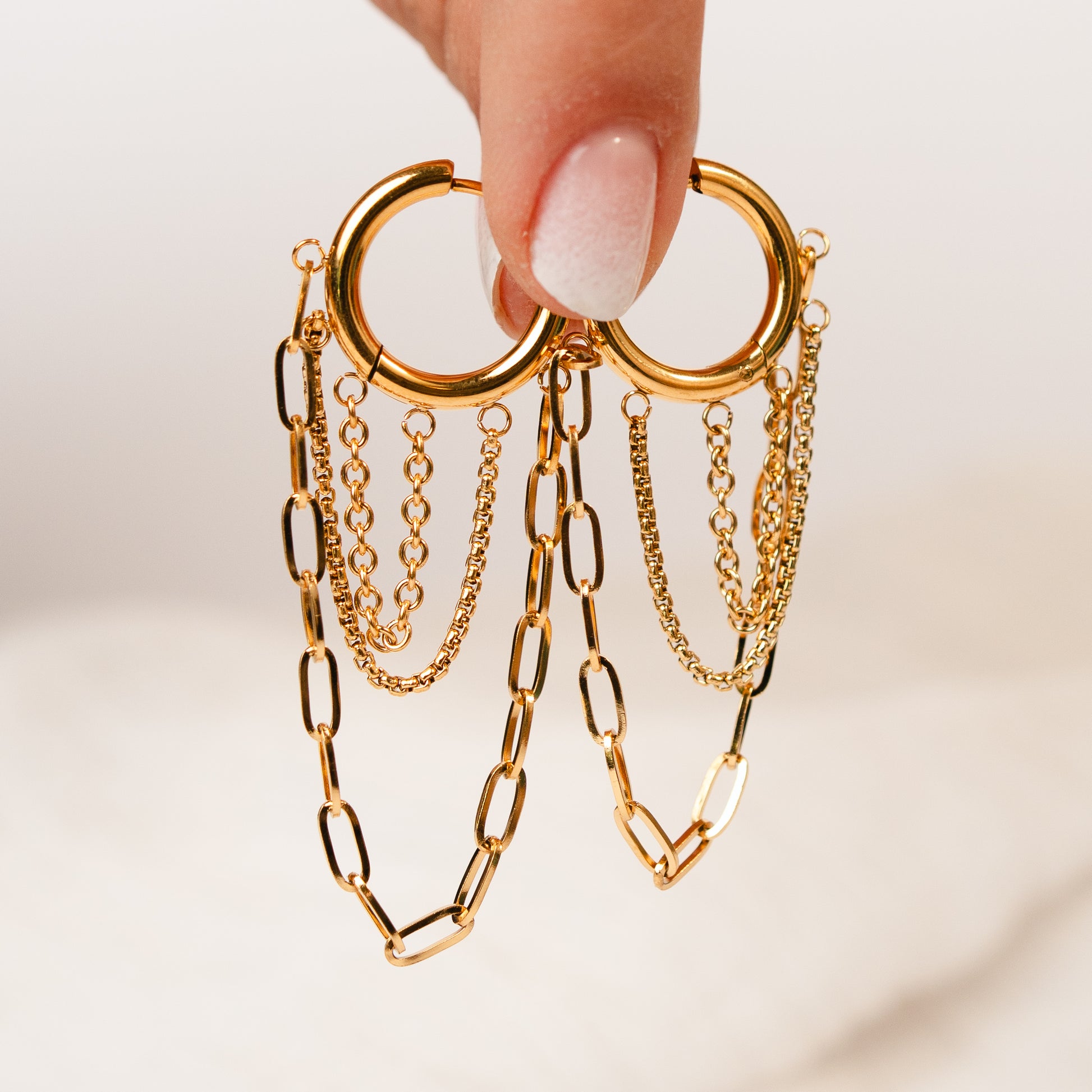 Los aros huggie cadenas bold gold son la joya ideal para quienes aman un estilo moderno y atrevido. Su diseño combina una argolla dorada con múltiples cadenas colgantes, creando un movimiento fluido y lleno de carácter que convierte cualquier outfit en un look de impacto.