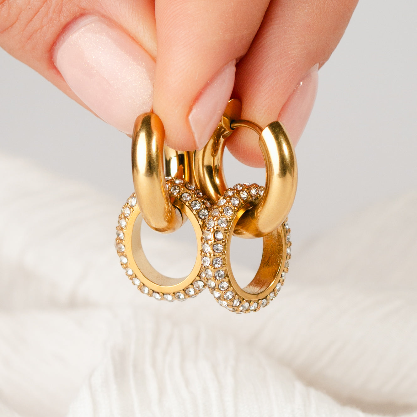 Un diseño moderno y luminoso que combina estilo y sofisticación. El contraste entre la argolla lisa y el aro con circones crea un efecto equilibrado, llamativo y muy chic. Son el complemento ideal para elevar un outfit básico o para acompañar un look más formal con un toque de glamour.