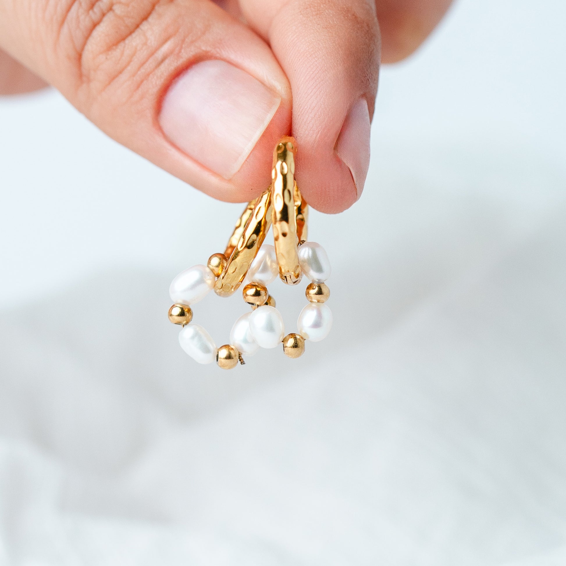 Argollas doradas con textura martillada y aro colgante formado por perlas y bolitas metálicas que aportan movimiento y un estilo femenino elegante. Su diseño combina brillo cálido y delicadeza, ideal para elevar looks diarios o complementar outfits especiales con un toque sofisticado.