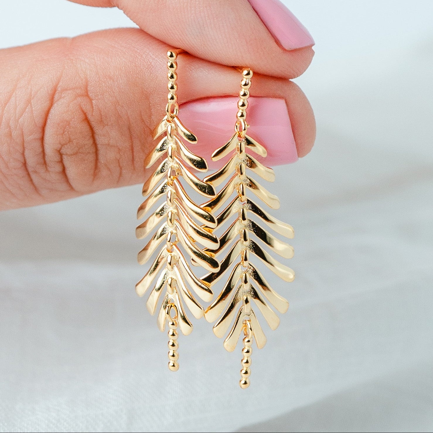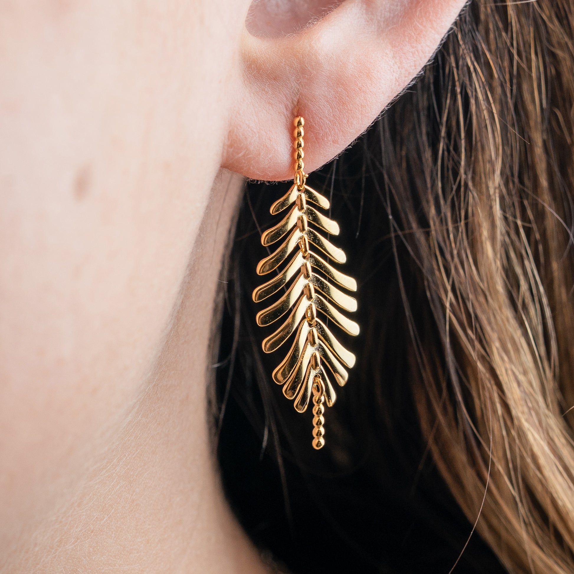 Aros colgantes de plata 925 bañado en oro de 18K con diseño de hojas estilizadas formadas por piezas móviles que aportan movimiento, brillo y un efecto visual elegante al usarlos. Su forma alargada y liviana estiliza el rostro y convierte esta joya en un accesorio llamativo, femenino y sofisticado.