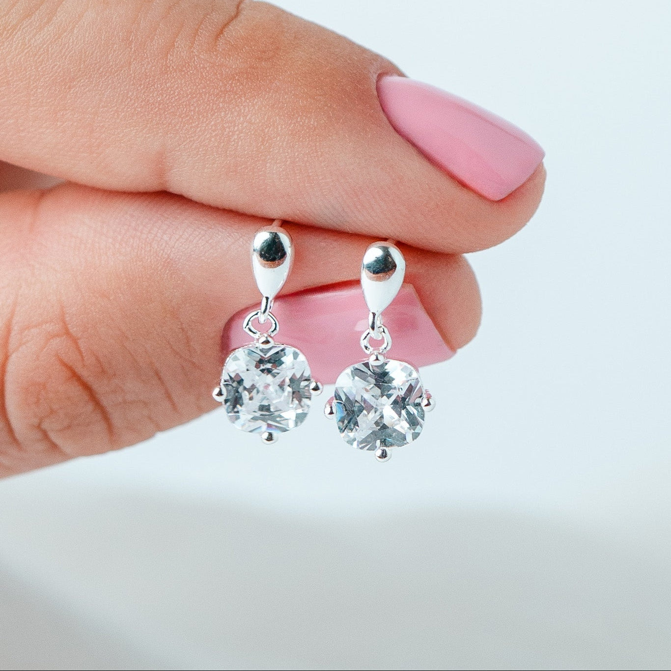 Aros colgantes de plata 925 con piedra tipo punto de luz de corte cuadrado, montada en un delicado engaste que permite resaltar al máximo su brillo. Su diseño combina un pequeño stud pulido con una caída sutil, aportando movimiento, luz y elegancia al rostro.