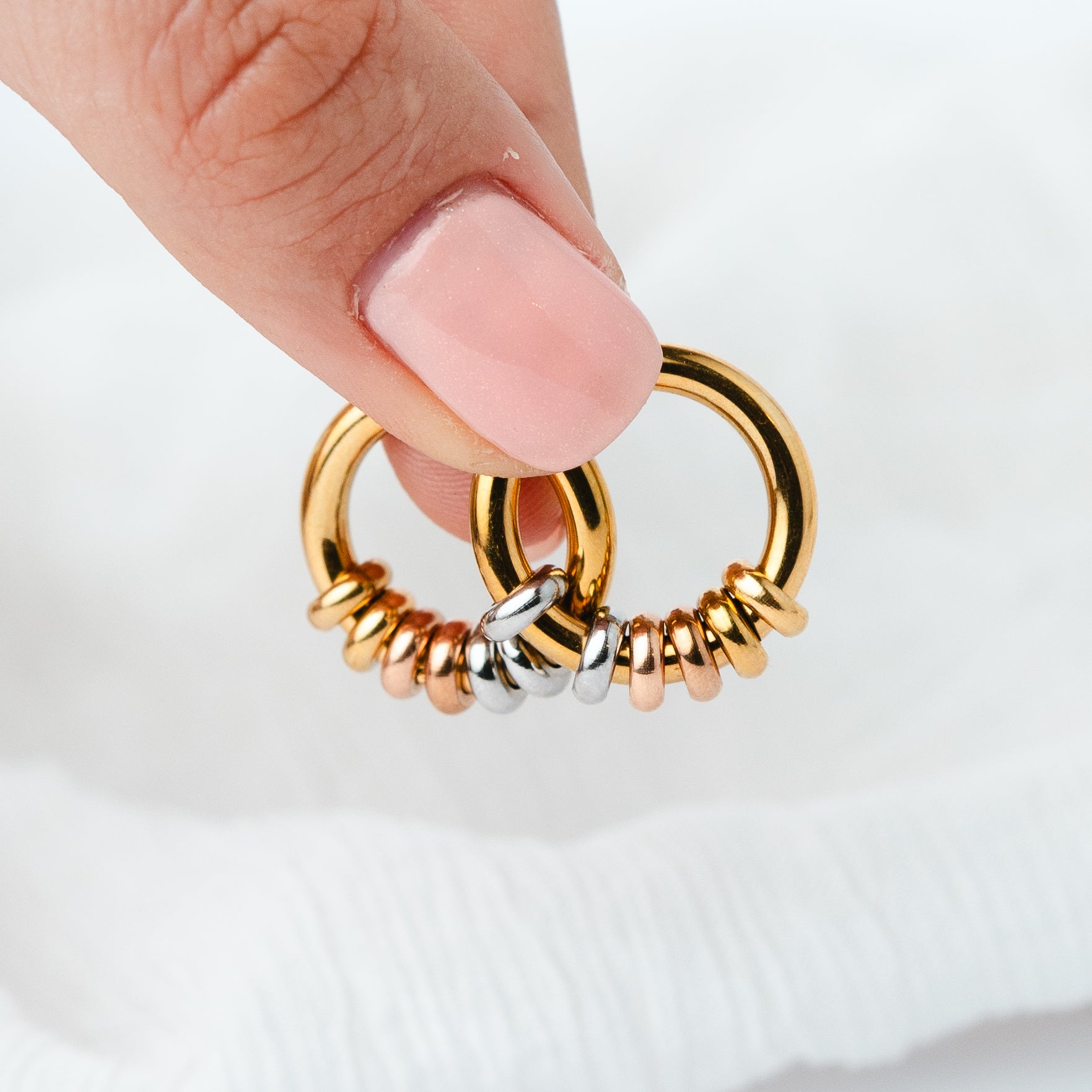 Cada pequeño aro móvil añade brillo y dinamismo al diseño, generando un contraste elegante y delicado. Son el complemento perfecto para quienes aman los detalles distintos, versátiles y con un toque de estilo contemporáneo sin exageraciones.