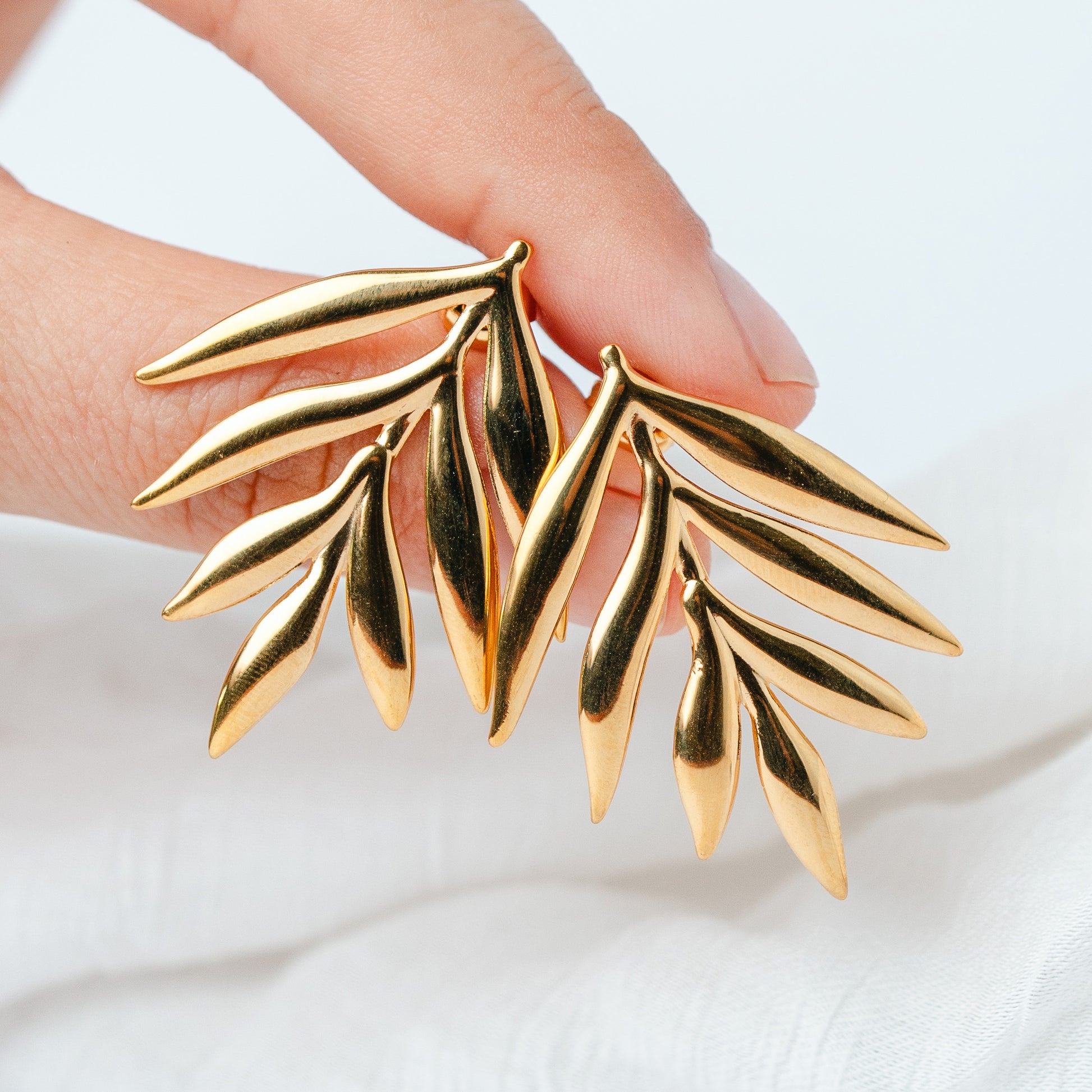 Aros de diseño orgánico inspirados en hojas, con acabado dorado brillante que aporta un look elegante y moderno. Su forma estilizada y volumen ligero los convierte en una pieza llamativa pero sofisticada, ideal para complementar desde outfits diarios hasta looks más formales.