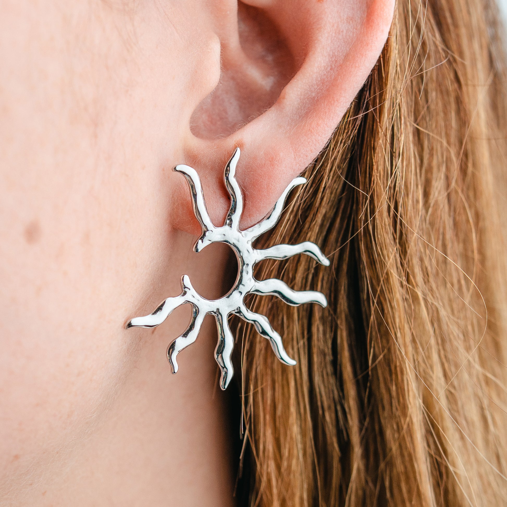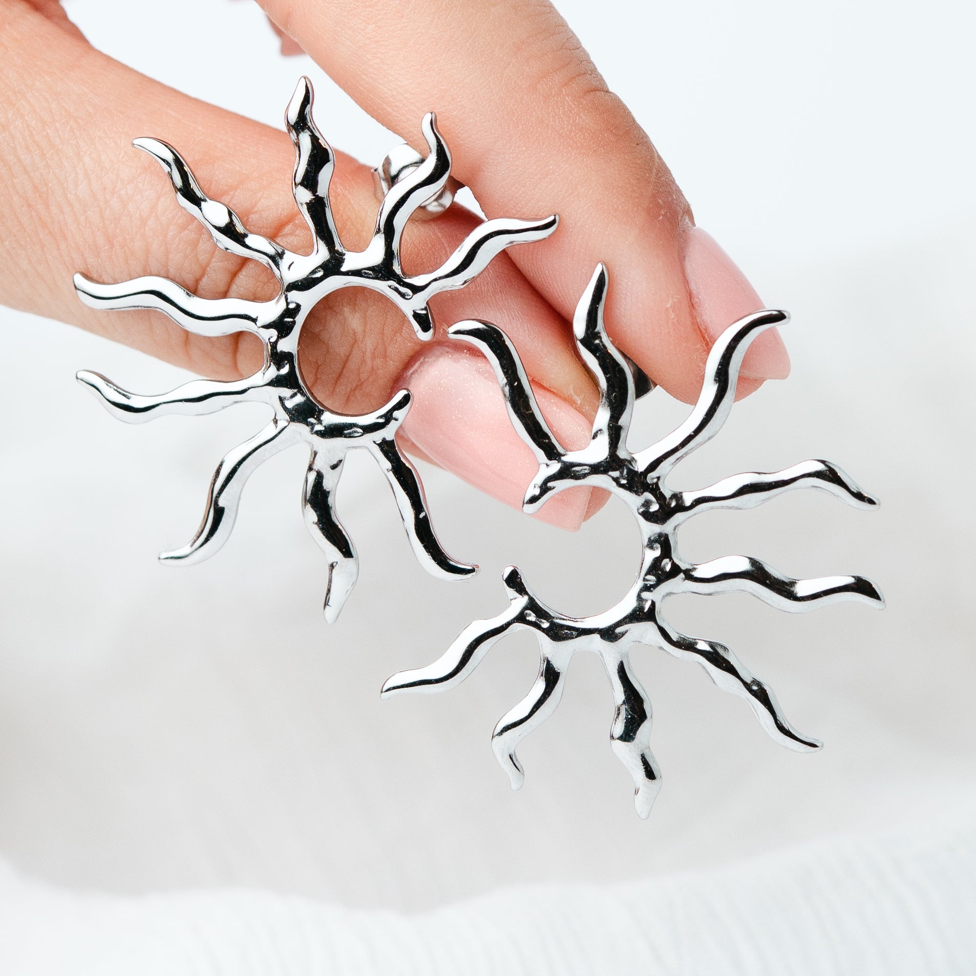 Un diseño artístico y lleno de personalidad. Los Aros de Sol Silver destacan por sus rayos fluidos y ondulados que crean un efecto único, moderno y llamativo. Su forma circular abierta aporta movimiento y luminosidad, haciendo que estos aros sean un verdadero statement piece.