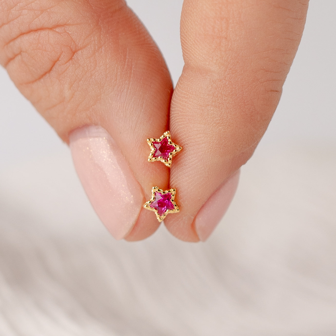 Aros pegados estrella fucsia cierre pelotita bañado en oro