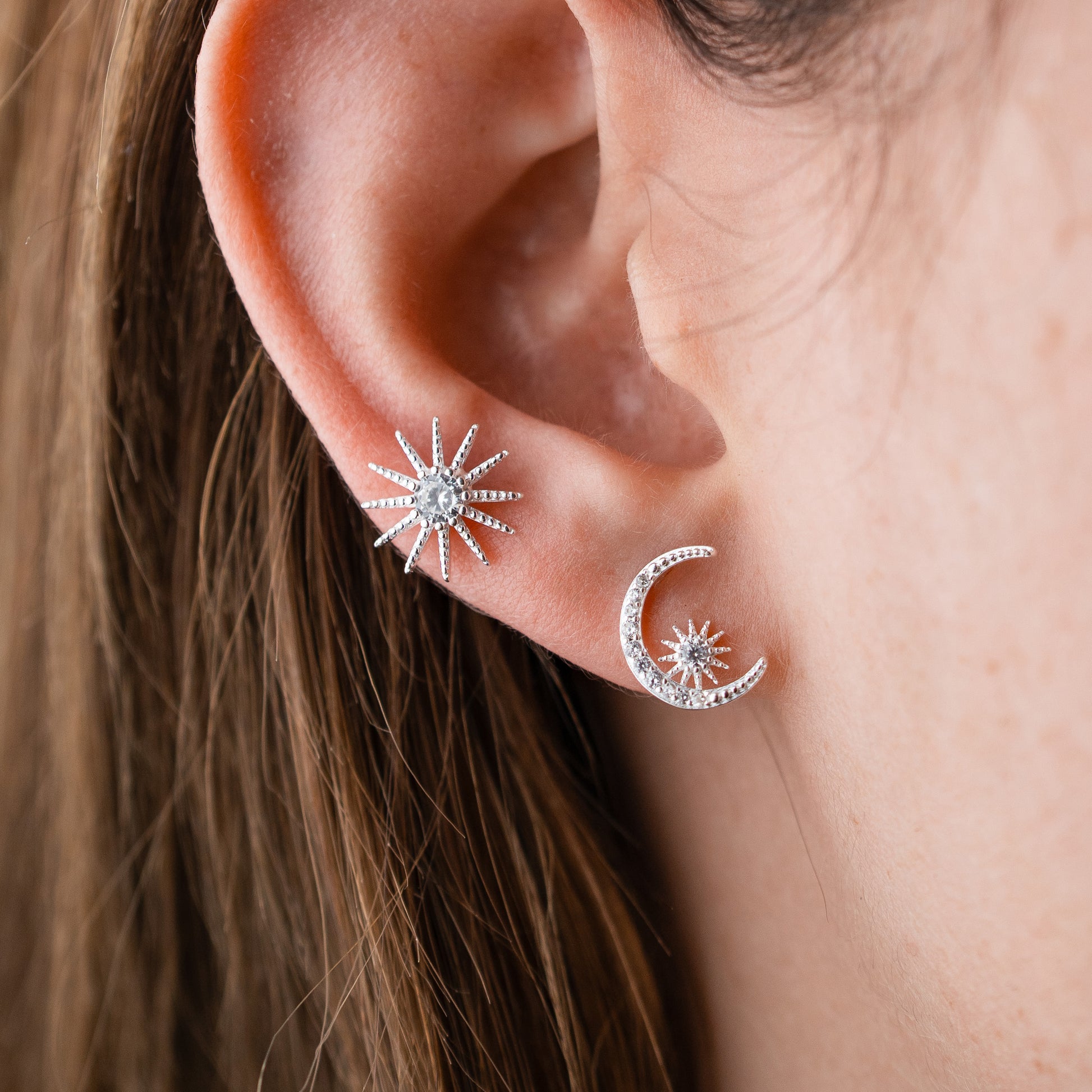 Estos aros combinan una sol radiante y una delicada luna creciente, creando un diseño asimétrico moderno, femenino y lleno de intención.