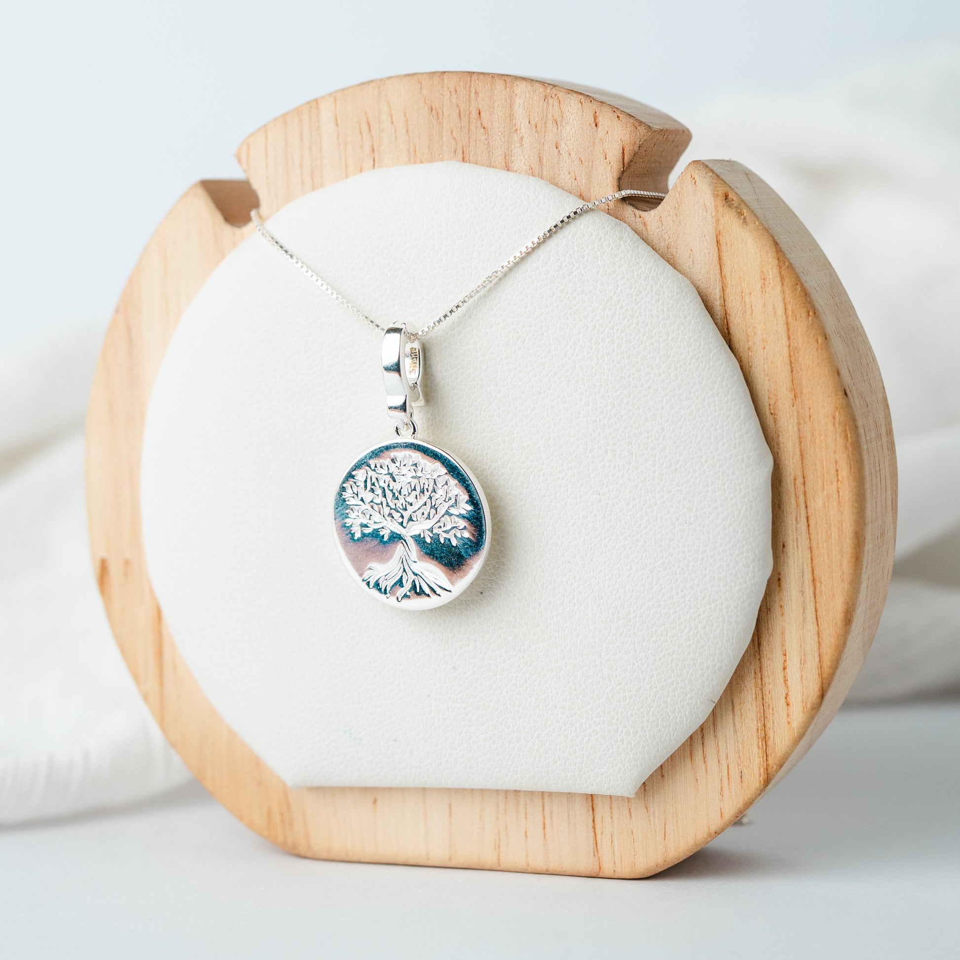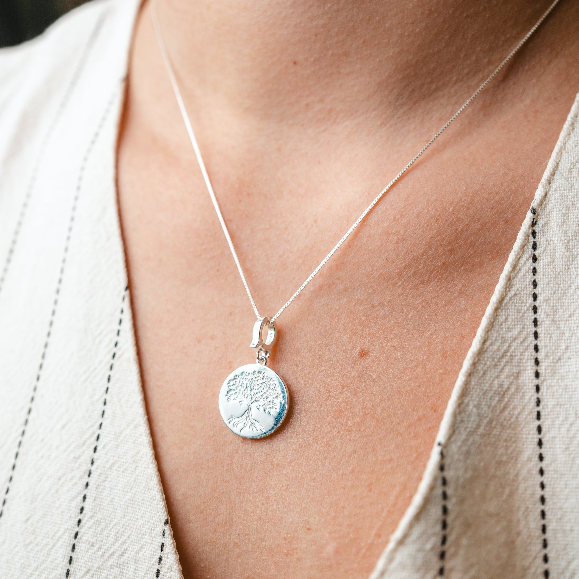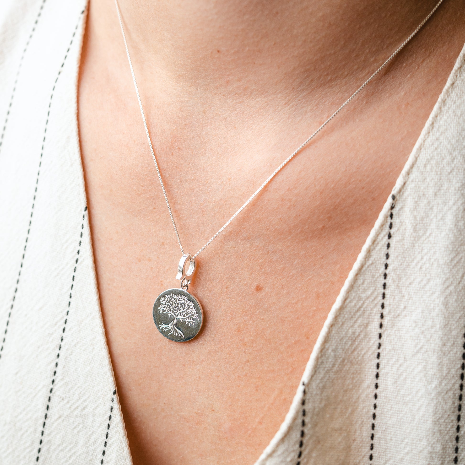 Collar de plata 925 con dije redondo grabado con diseño de árbol de la vida, un símbolo de conexión, crecimiento y equilibrio. Su acabado liso y pulido realza el delicado grabado, creando una pieza elegante, significativa y atemporal.