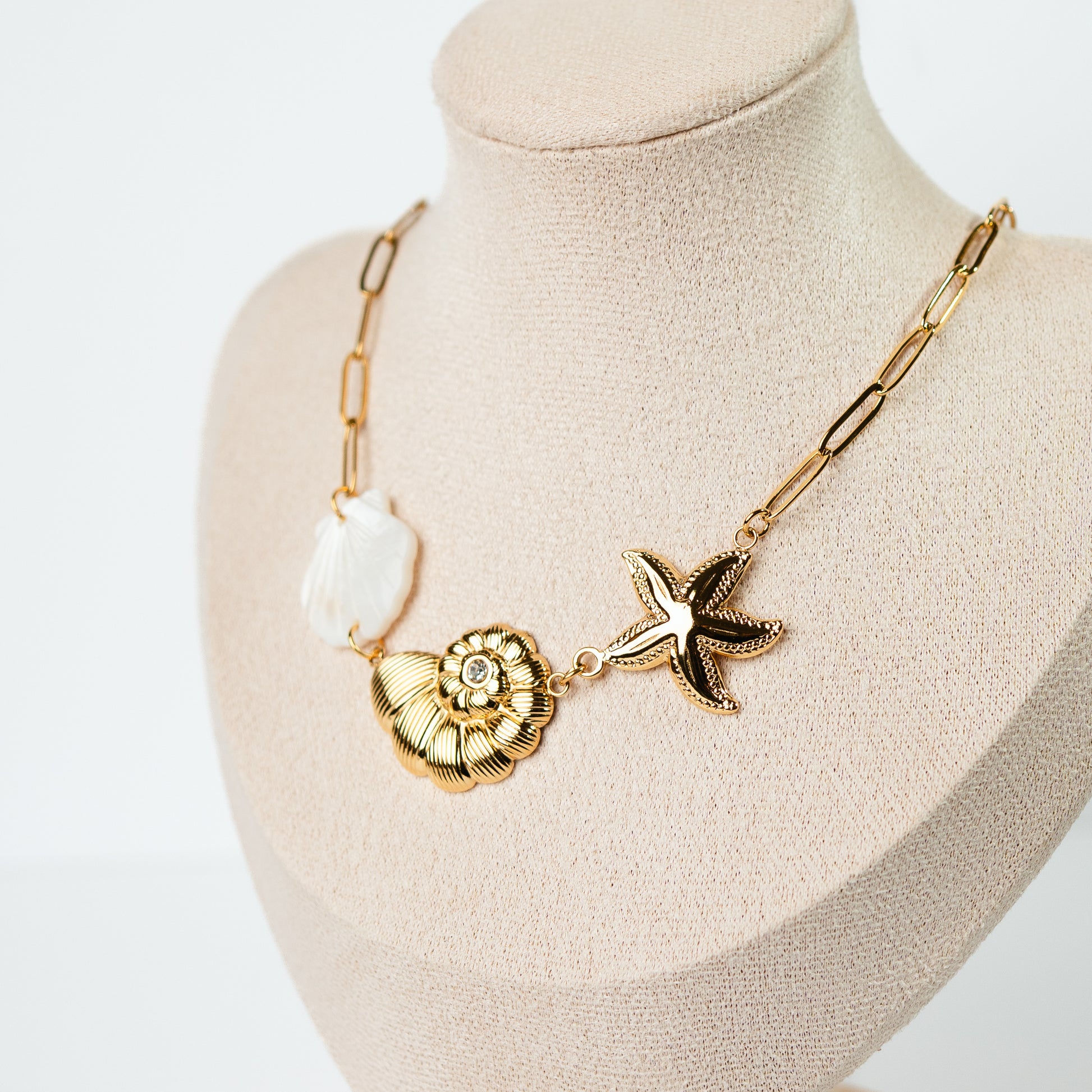 Este collar combina armonía y brillo en una composición inspirada en la vida marina.