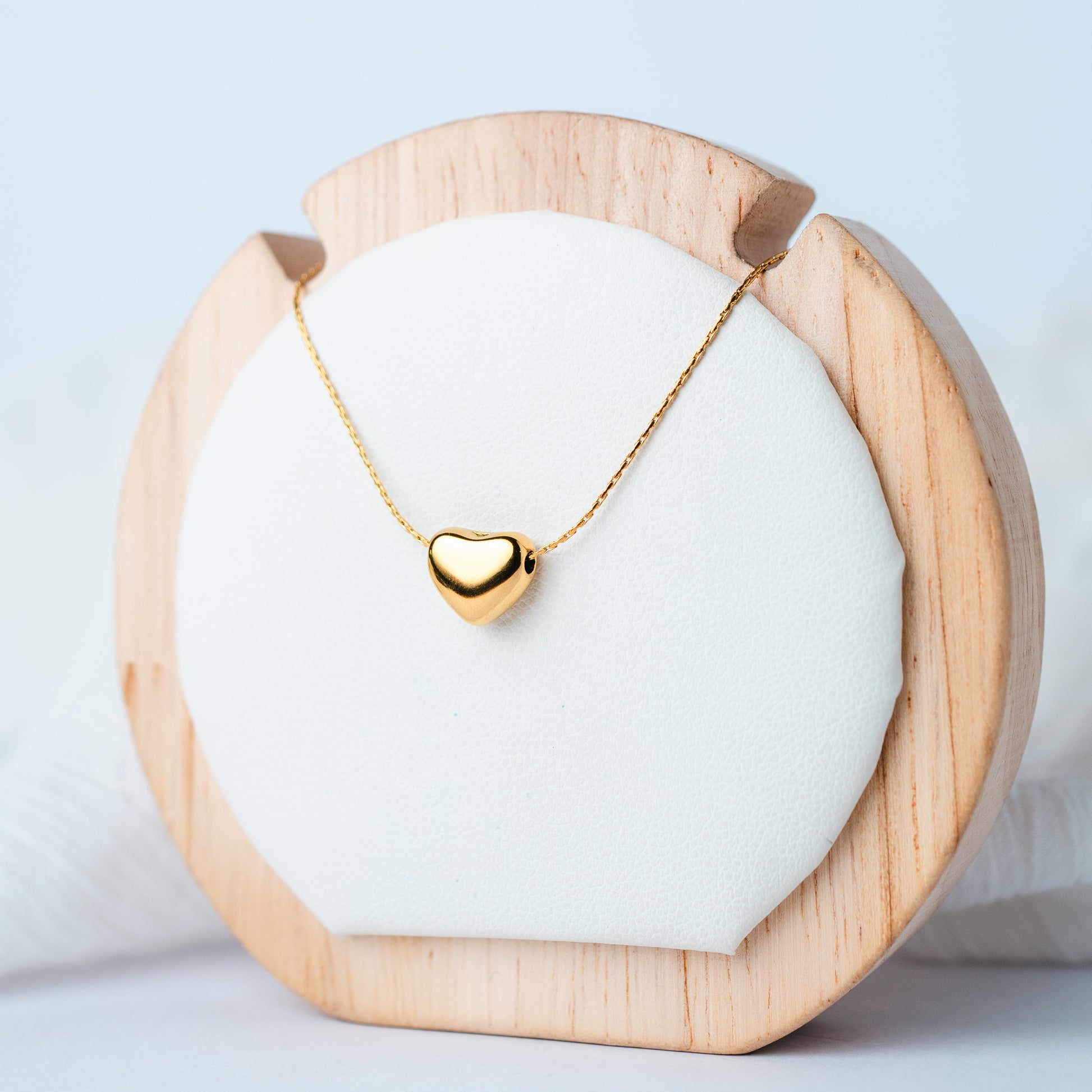 Collar delicado bañado en oro de 18K con un pequeño corazón central de acabado pulido y brillante. Su diseño minimalista lo convierte en una pieza romántica y versátil, perfecta para usar todos los días o combinar en capas con otros collares.