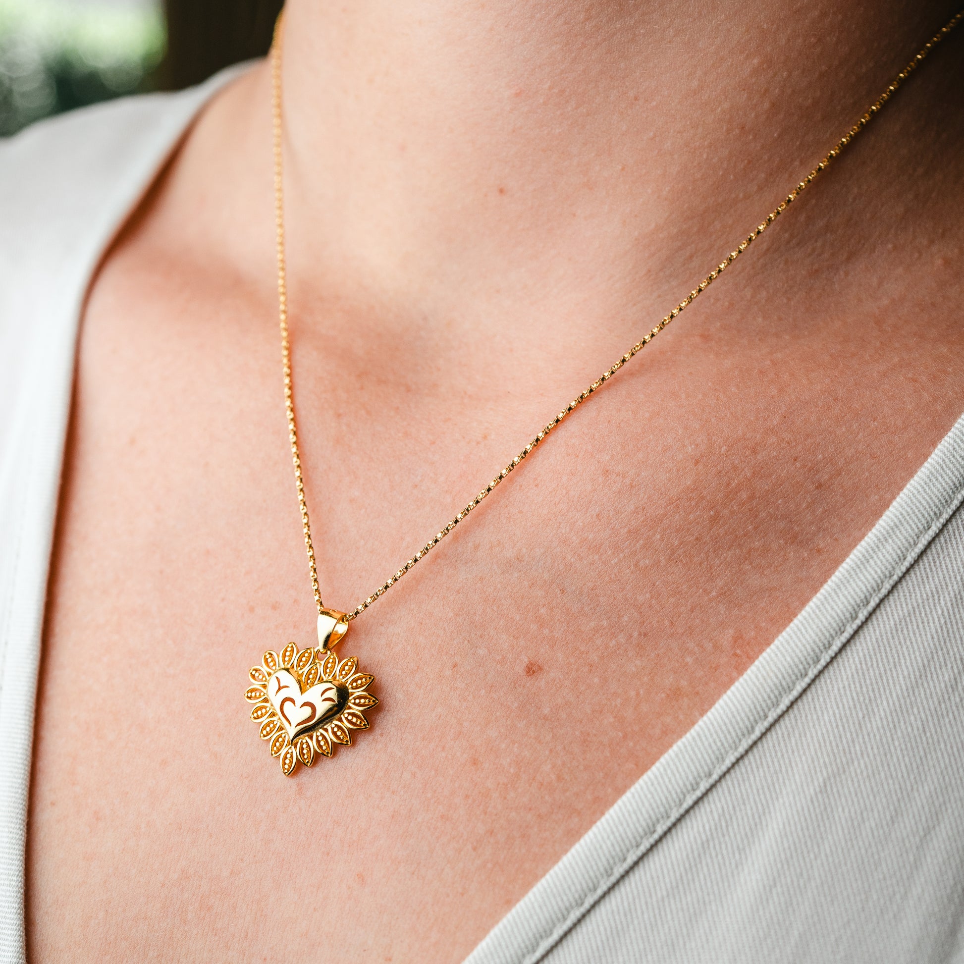 Este collar presenta un delicado corazón ornamentado con detalles calados que evocan protección, entrega y fuerza interior. Su diseño protagonista ilumina el escote con un brillo sutil pero inolvidable.