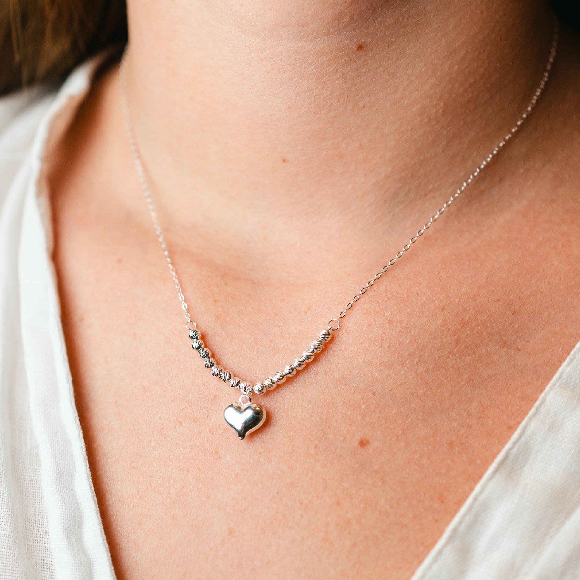 Collar en plata 925 con una cadena de mostacillas plateadas y un dije de corazón pulido que refleja la luz con un brillo suave.