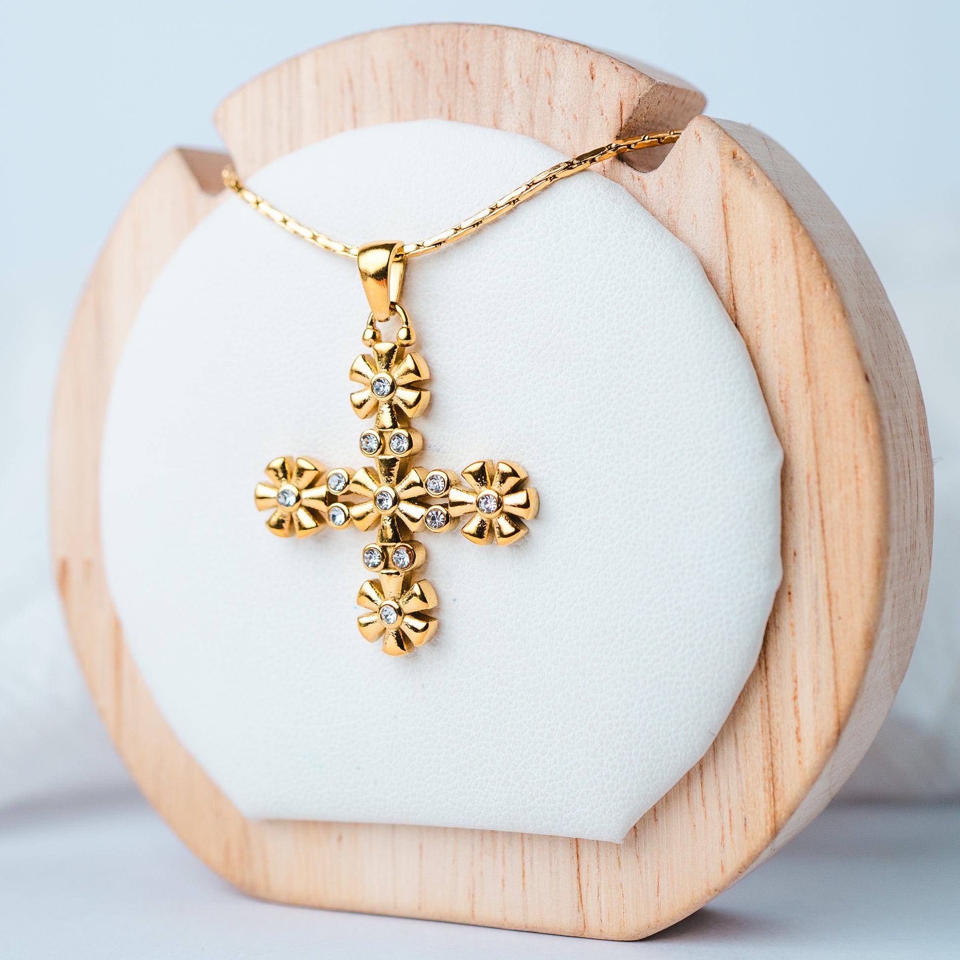 Collar delicado con colgante de cruz formada por flores con circones en el centro, un diseño femenino y elegante que combina simbolismo con detalles brillantes. Ideal para usar a diario o complementar looks más especiales.