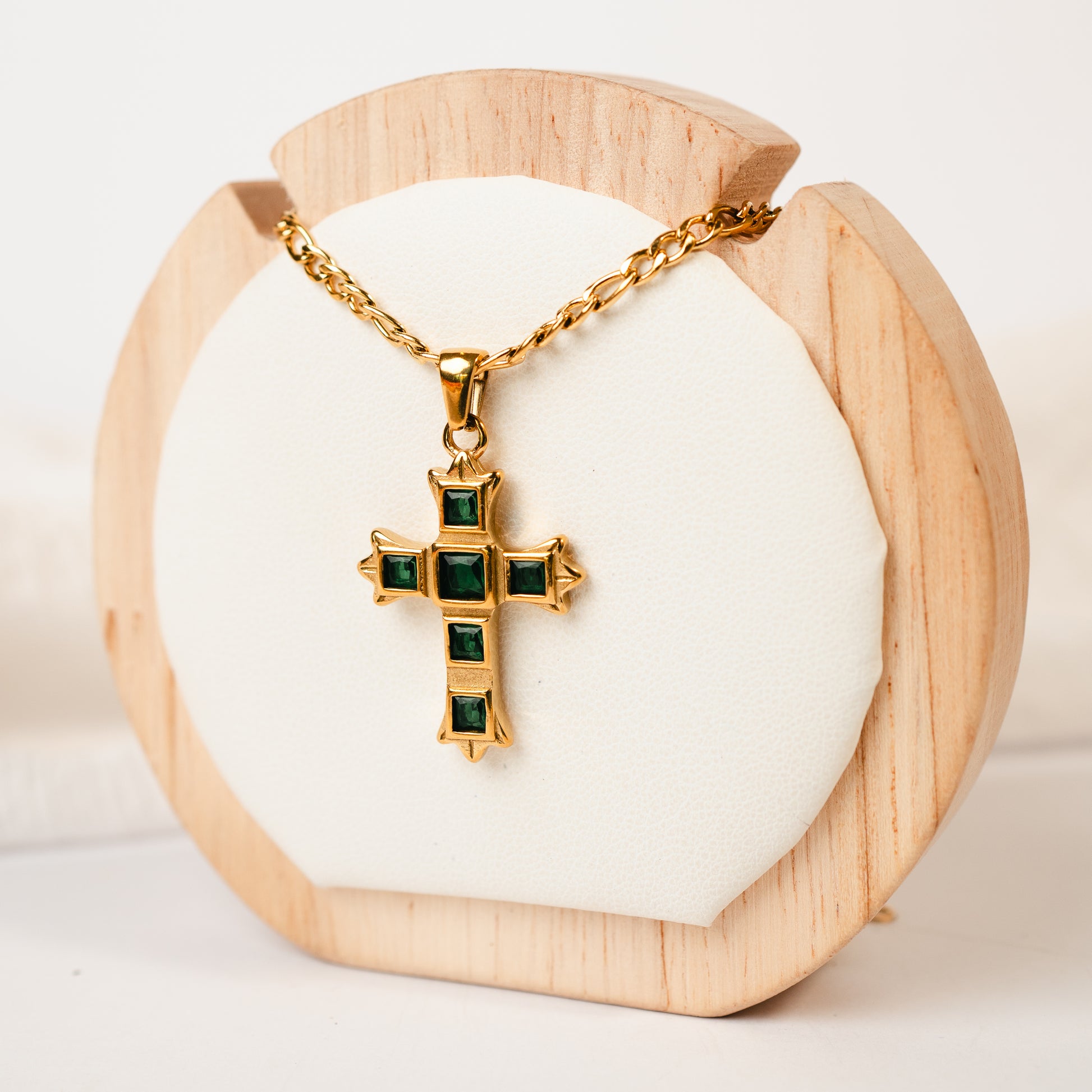El Collar Cruz Esmeralda Dorada combina el brillo del baño de oro con el intenso verde de sus cristales, creando una pieza que simboliza equilibrio, fe y energía positiva. Ideal para llevar sola o acompañada de otras cadenas, su estilo atemporal la convierte en una joya significativa para cualquier ocasión.