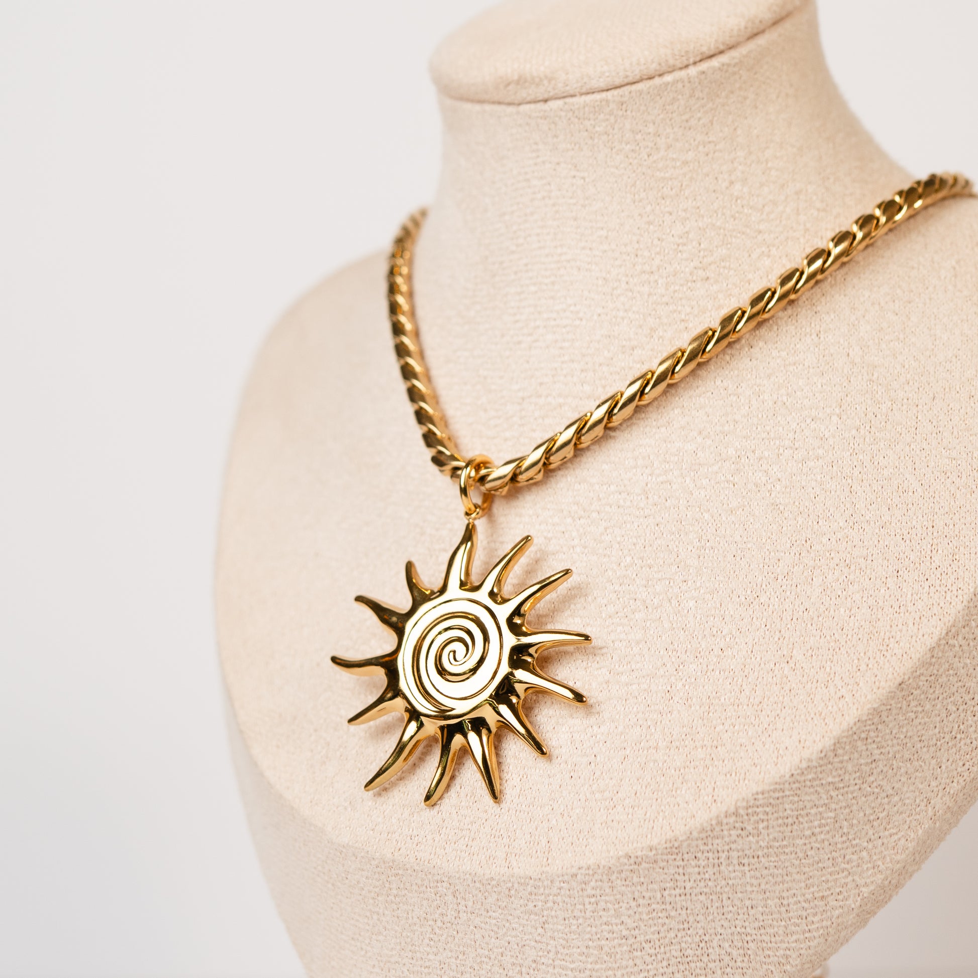 Destaca con energía y estilo con este collar, una pieza imponente que combina fuerza y elegancia. Su diseño presenta un colgante en forma de sol con detalles en espiral central, símbolo de vitalidad y renacimiento, suspendido de una cadena gruesa bañada en oro que aporta carácter y presencia.