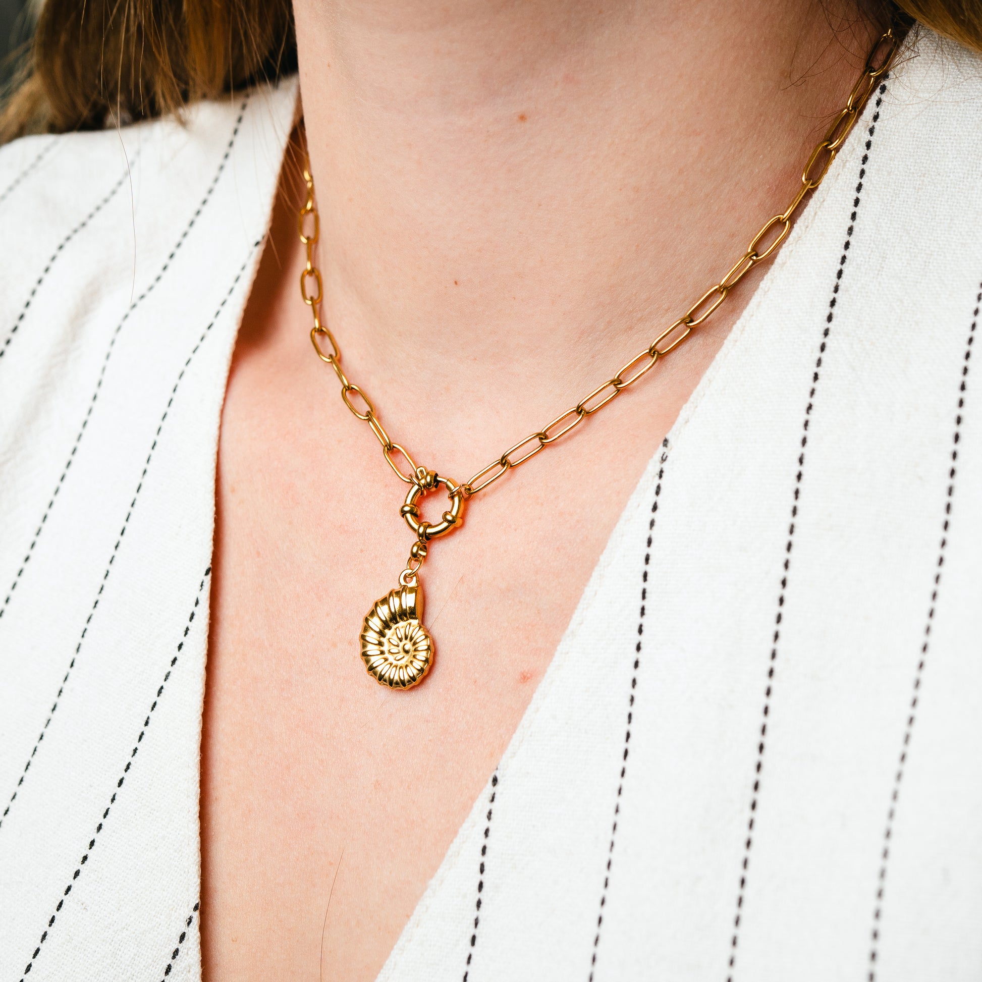 Un collar de estilo statement que combina diseño moderno con un toque inspo natural. Su cadena de eslabones gruesos y el cierre frontal tipo timón lo convierten en una pieza llamativa y actual, mientras que el dije en forma de fósil ammonite aporta ese aire artístico y sofisticado que lo hace único.
