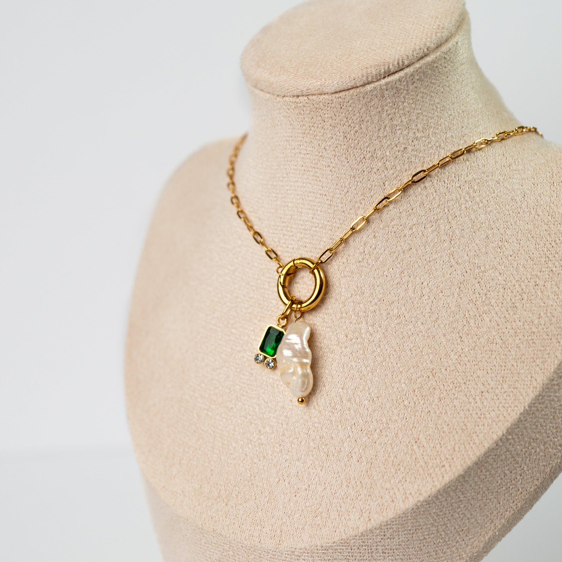 Collar de timón y conchita circón verde bañado en oro