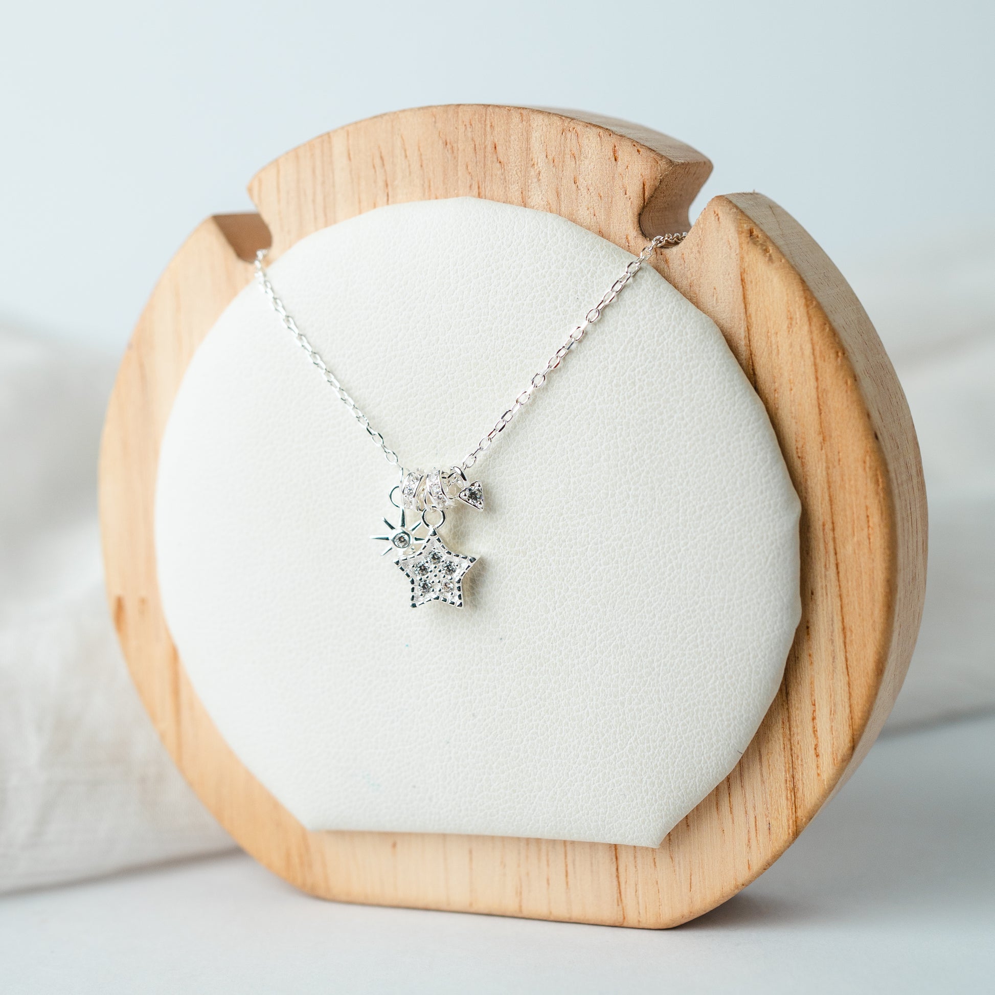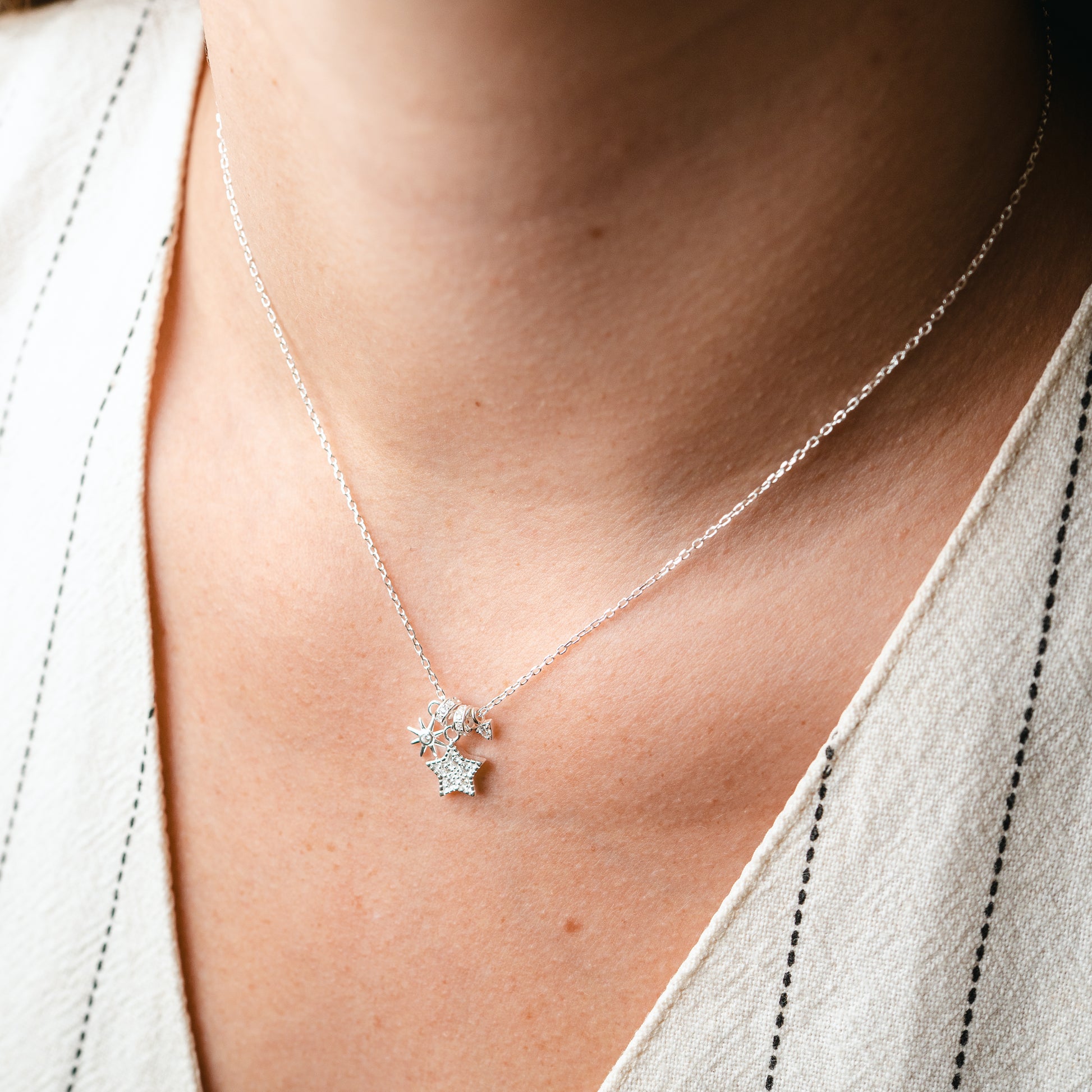 Collar de plata con delicados dijes colgantes de inspiración celestial, que combinan una estrella con circones brillantes y un pequeño sol estilizado.