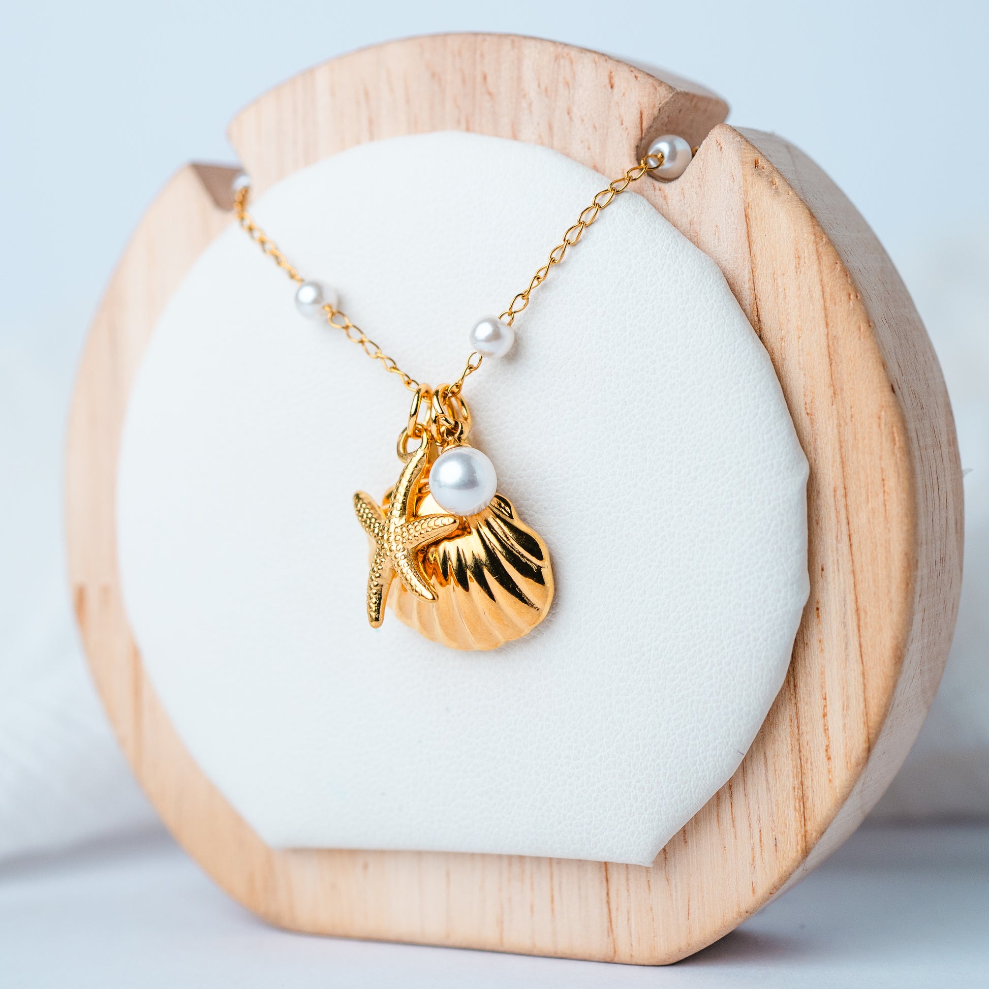 Collar delicado con colgante marino compuesto por concha texturada, estrella de mar y perla decorativa. Su diseño combina brillo dorado con detalles orgánicos, creando una pieza femenina, luminosa y perfecta para looks de verano o uso diario con un toque especial.