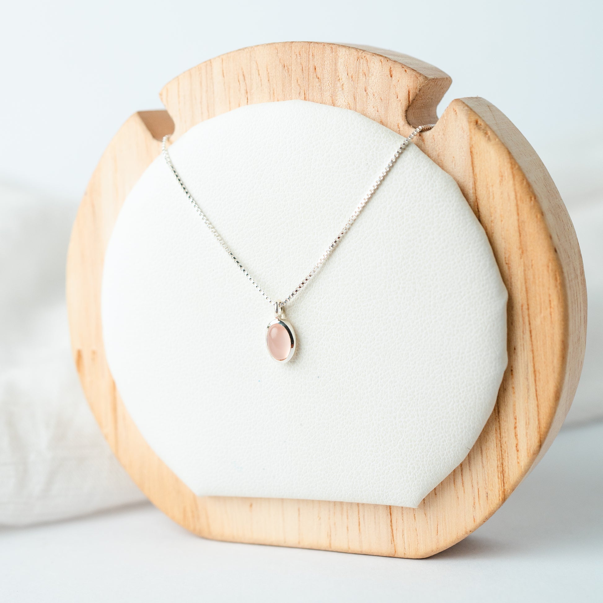 Collar de plata con dije ovalado de piedra cuarzo rosa, montada en un delicado marco liso que realza su tono suave y femenino. Su diseño minimalista permite que la piedra sea la protagonista, transmitiendo amor, dulzura y energía armoniosa.