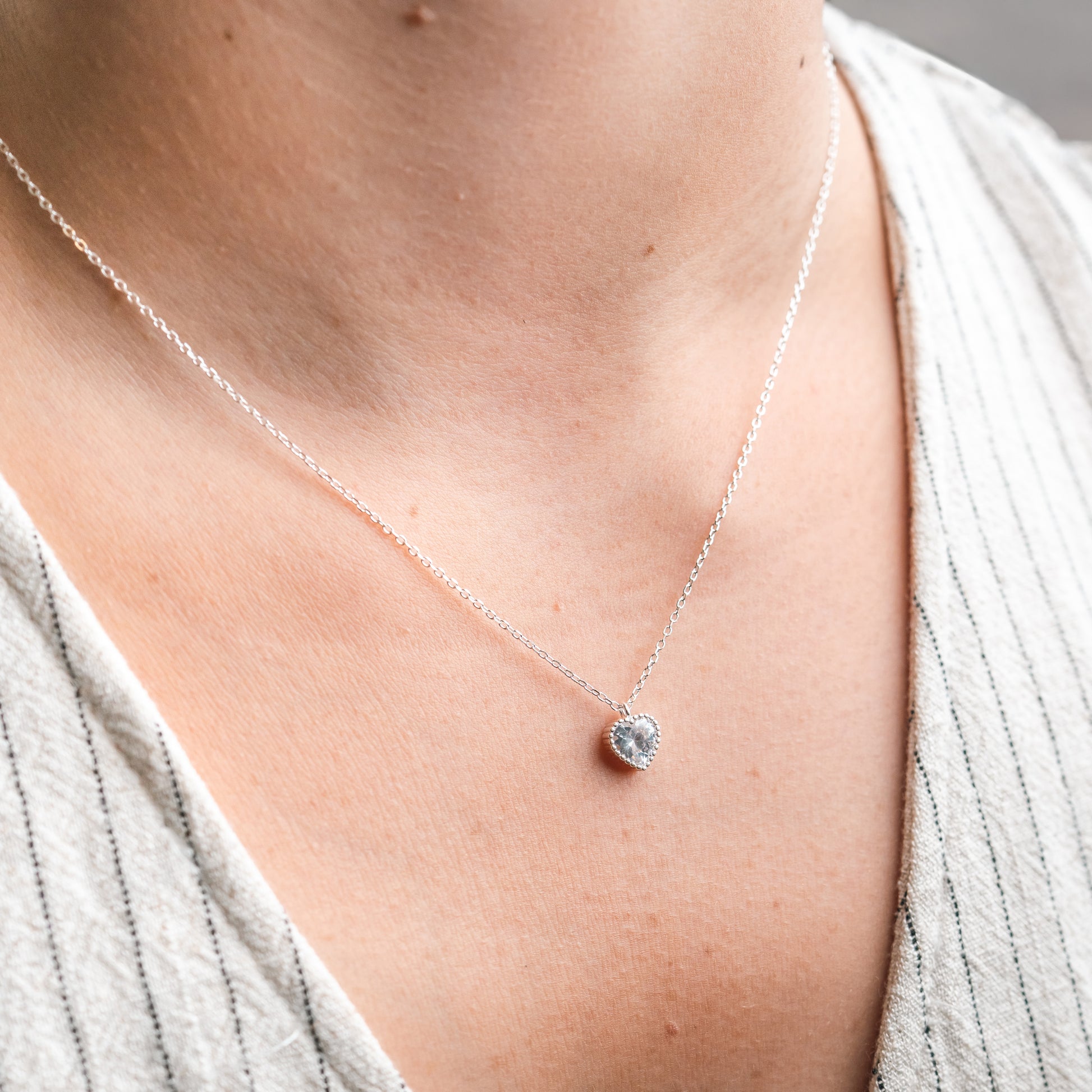 El Collar punto corazón está elaborado en plata 925 con un dije de circón en forma de corazón, que refleja cada destello con elegancia y sutileza.