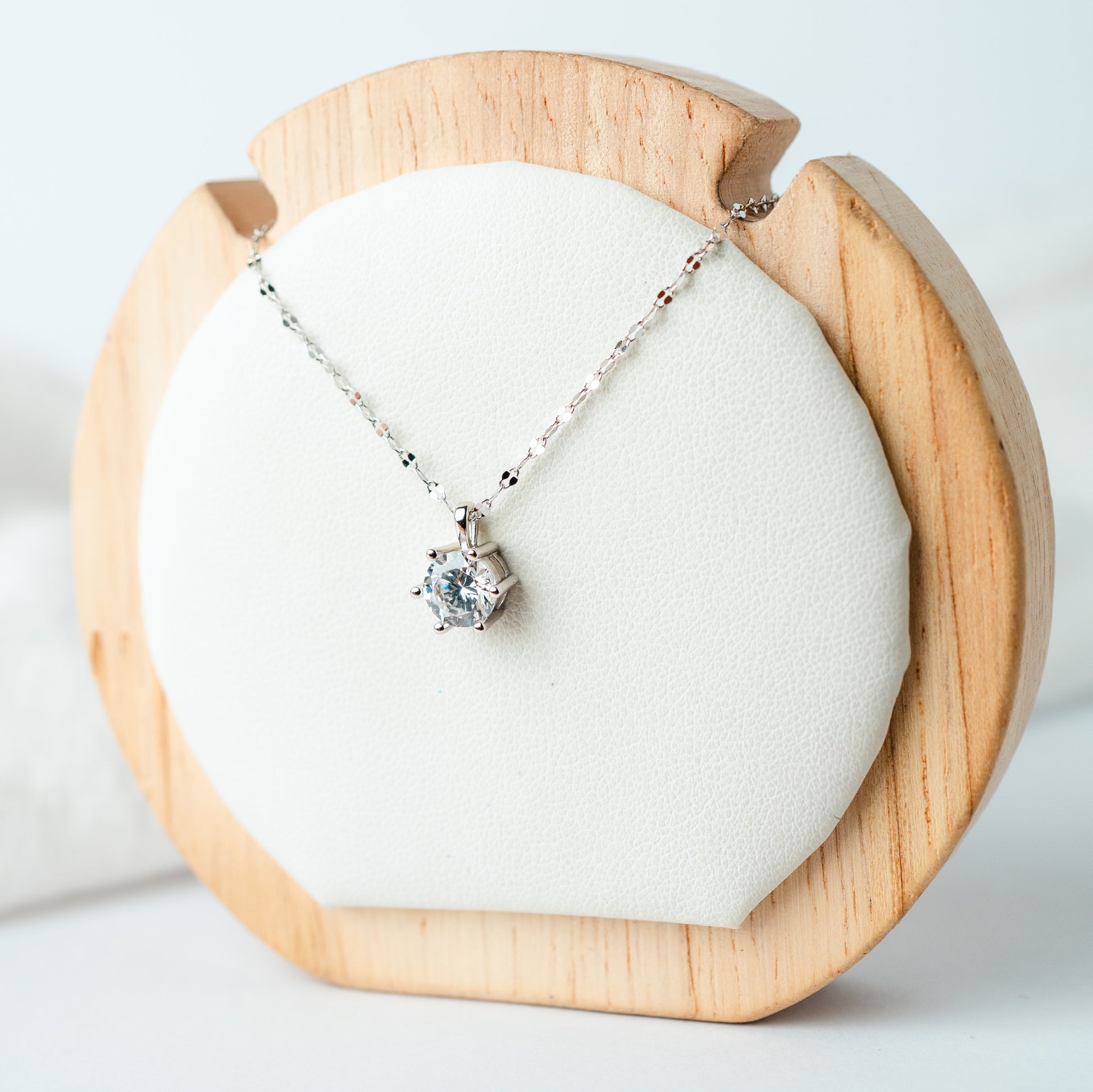 Collar delicado de plata 925 con un elegante punto de luz central que captura la luz desde cualquier ángulo. Su circonia transparente, engastada con garras finas, realza el brillo de la piedra sin restarle protagonismo, logrando un diseño atemporal y sofisticado.