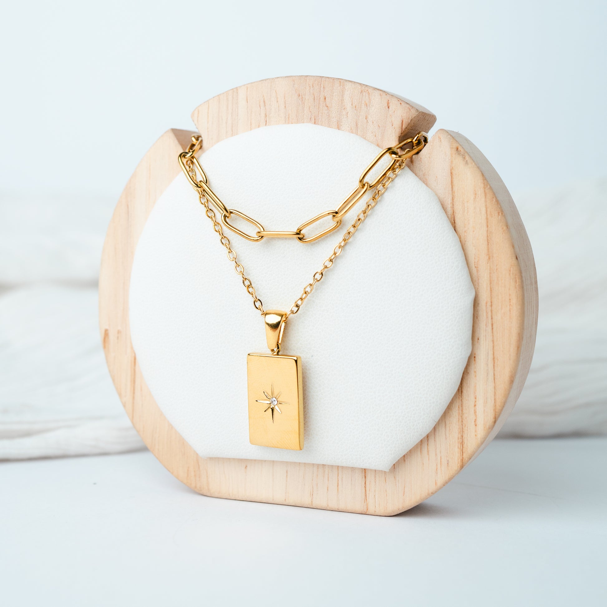 Un set de dos collares que combinan a la perfección estilo, brillo y modernidad. La primera cadena es un choker de eslabones alargados tipo paperclip, moderno y con presencia. La segunda cadena, más fina y delicada, sostiene una placa rectangular pulida con una estrella grabada al centro y un circon brillante que simboliza guía, protección y claridad.