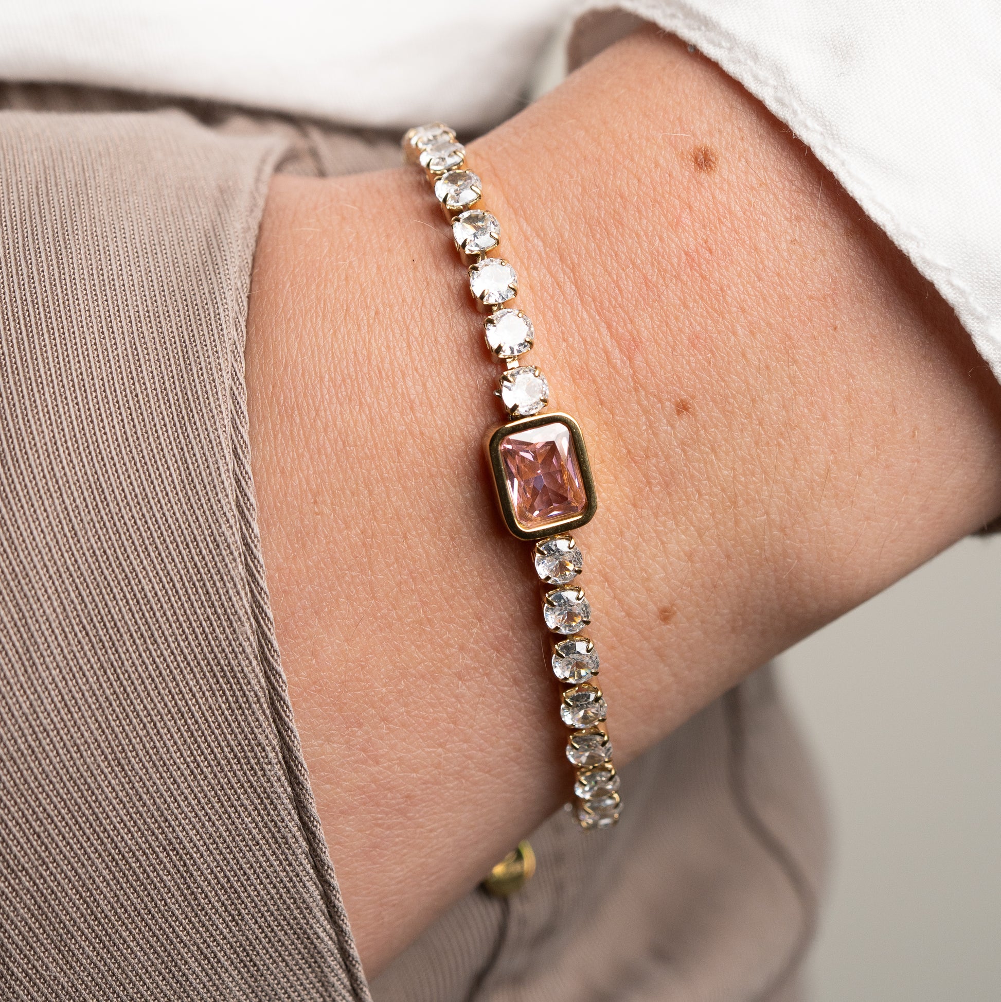 Pulsera circones y circón rosa bañado en oro