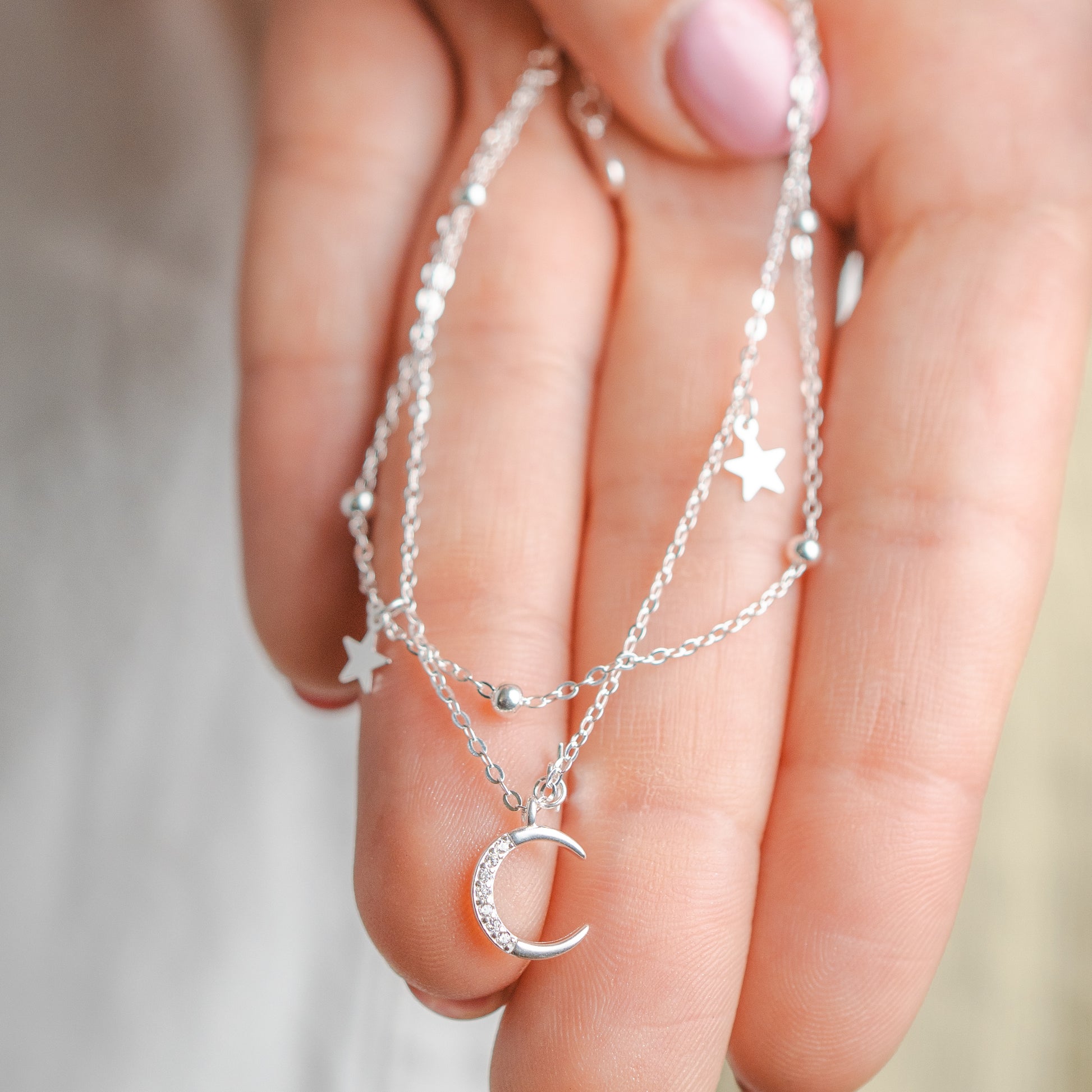 Pulsera doble de plata 925 con delicados detalles de estrellas y un dije de luna con circones que aporta un brillo sutil y femenino. Su diseño celestial y elegante la convierte en una pieza ideal para usar todos los días o combinar con otras pulseras para un look delicado y moderno.