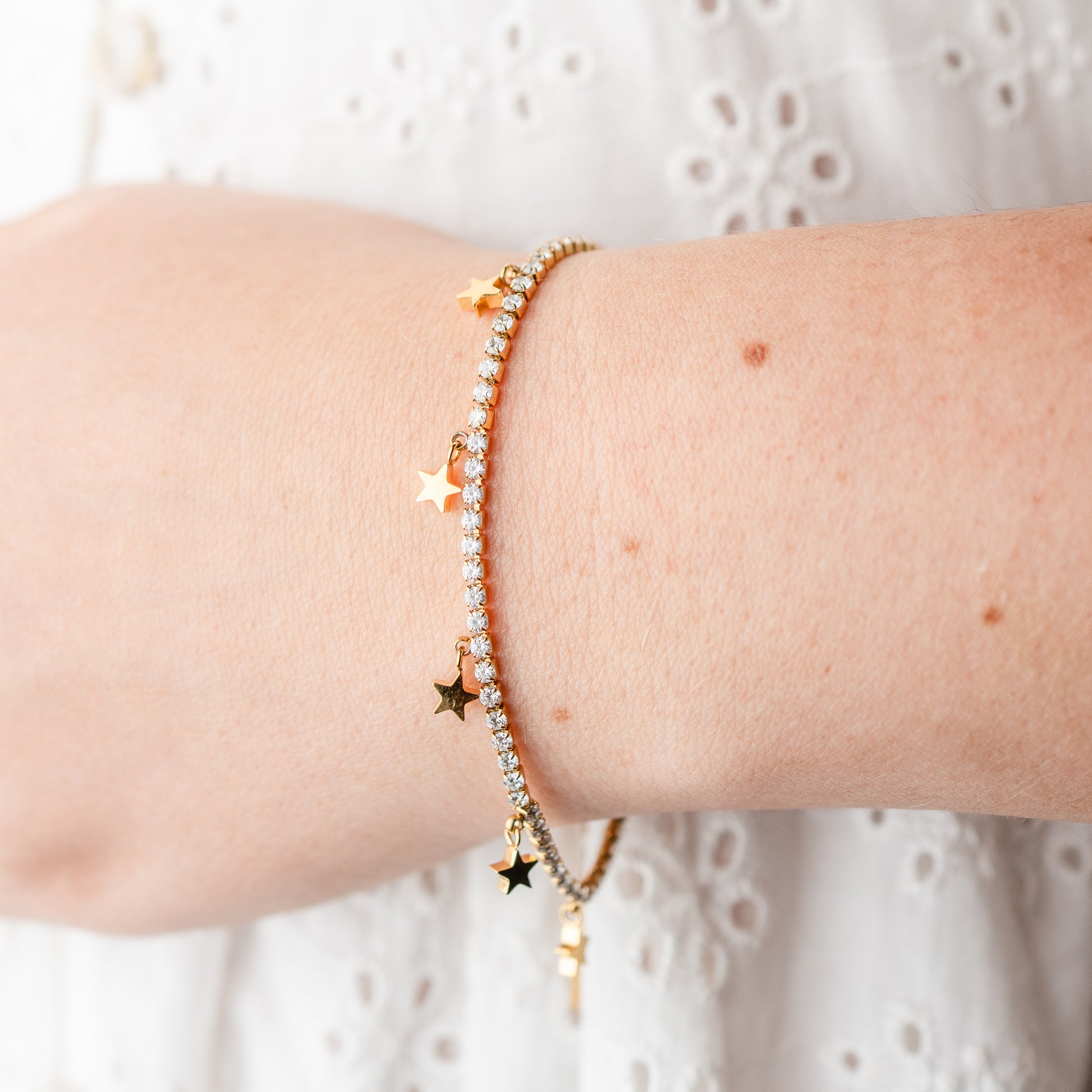 - Tipo: Pulsera tipo tennis con circones y estrellas colgantes