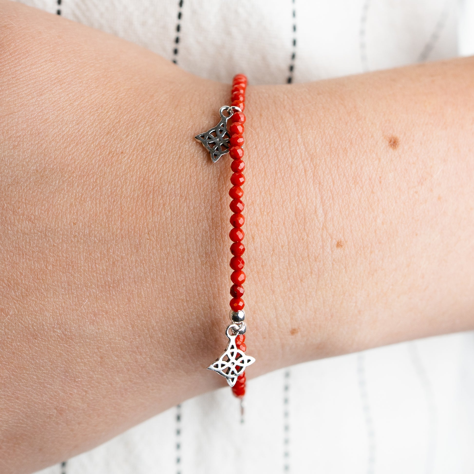 Las mostacillas rojas aportan fuerza, vitalidad y presencia, mientras que el nudo de bruja en plata 925 simboliza intuición, guía y resguardo espiritual. El contraste entre el rojo intenso y el brillo de la plata crea una pieza moderna, llamativa y profundamente significativa.